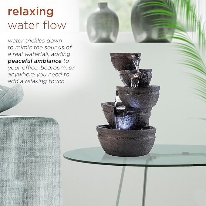 - Cascading Tiered Bowl Design: Features multiple bowls stacked in a tiered formation, allowing water to flow smoothly from one to the next, creating a gentle waterfall effect perfect for relaxation and ambiance.