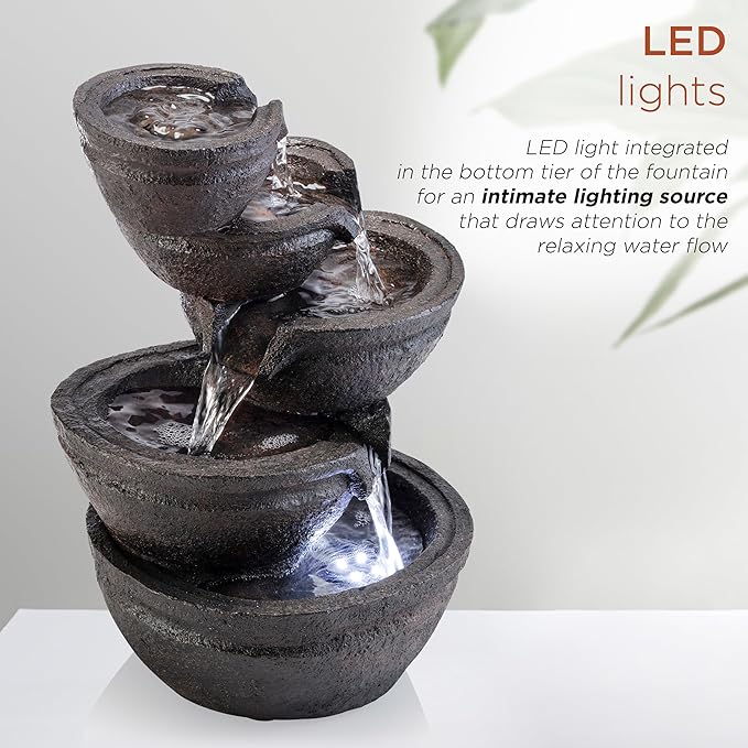 Alpine Corporation WIN1138 13" Indoor Tabletop Tiering Bowls Water Fountain with LED Lights – Cascading Water Feature for Home, Office, Meditation, and Relaxation, Dark Gray
