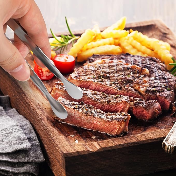- FOOD-GRADE STAINLESS STEEL - The high quality small serving tongs are made of stainless steel for outstanding durability. Don't worry about rust and discoloration. Smooth edges with no peaked edges for safe use and easy to handle. Best of all: These tongs are safe for food contact and long-term use!