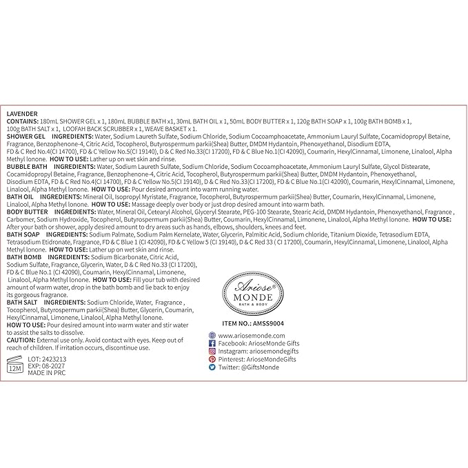 - BIG PACKAGE FOR LUXURIOUS SPA AT HOME: Bath soap, bath oil, body butter, shower gel, bath bomb, bath salt, bubble bath, loofah back scrubber. All the presentation of the spa set is very nice and cute, includes everything you need for the SPA