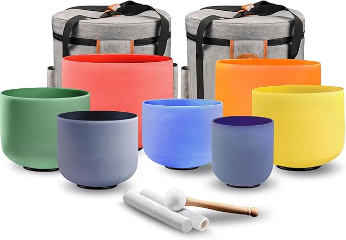 RYAN DVAN 432 hz 7-12 Inch Set of 7 Colored Frosted Quartz Crystal Singing Bowl with Free 2 pcs Carrying Cases