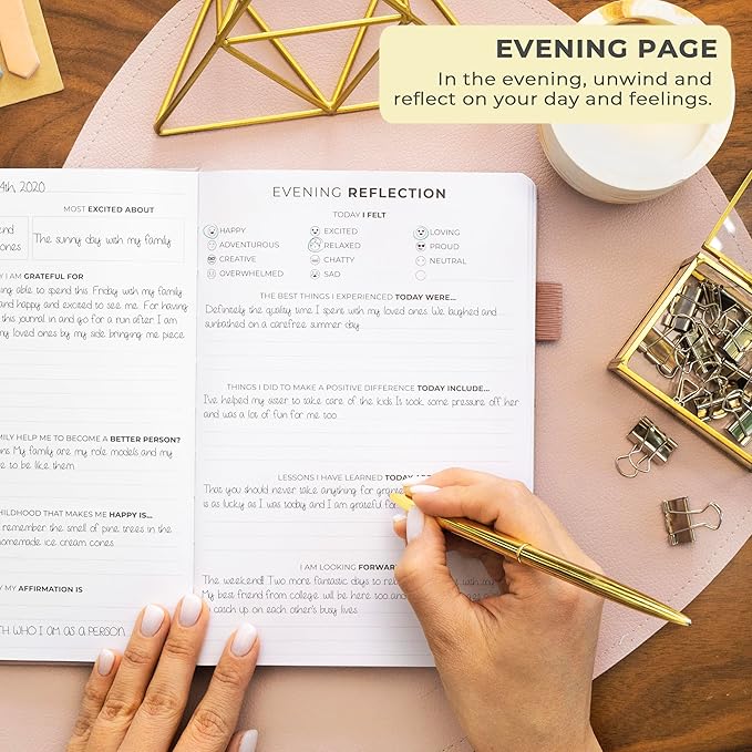 - STIMULATE GROWTH WITH DAILY REFLECTION: Reflect on your day and foster self-awareness with evening reflection pages and regular weekly exercises.