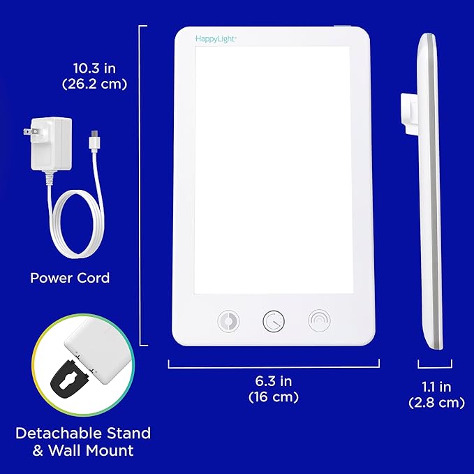 - Portable Design: The ultra-thin tablet design with a detachable stand and wall mount makes HappyLight Touch Plus portable enough for use at home or on the go. It fits easily on a desk, work area, or bedside for convenient light therapy wherever you need it.