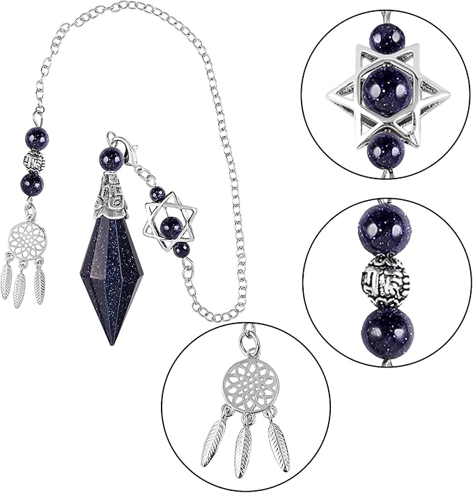 TUMBEELLUWA Reiki Healing Crystal Point Pendulum Dowsing Divination, Reiki Meditation Faceted Stone Pendant with Dream Catcher and Merkaba Star Chain, Blue Sand