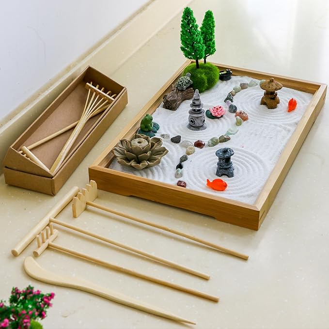 - INSPIRE & BE CREATIVE: Master the calming art of raking sand with 7 meticulously crafted handmade bamboo rakes and wooden sand stamp tools. Create stunning patterns in our indoor tabletop Zen sand garden. And learn more tips for using your Zen garden with the unique guide included with your mini Japanese garden