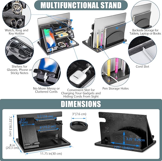 Black Wood Phone Docking Station - Wood Charging Station Organizer Stand, Bedside Nightstand Organizer for Men and Women, Holds Phone, Tablet, Keys, Glasses, EDC and more
