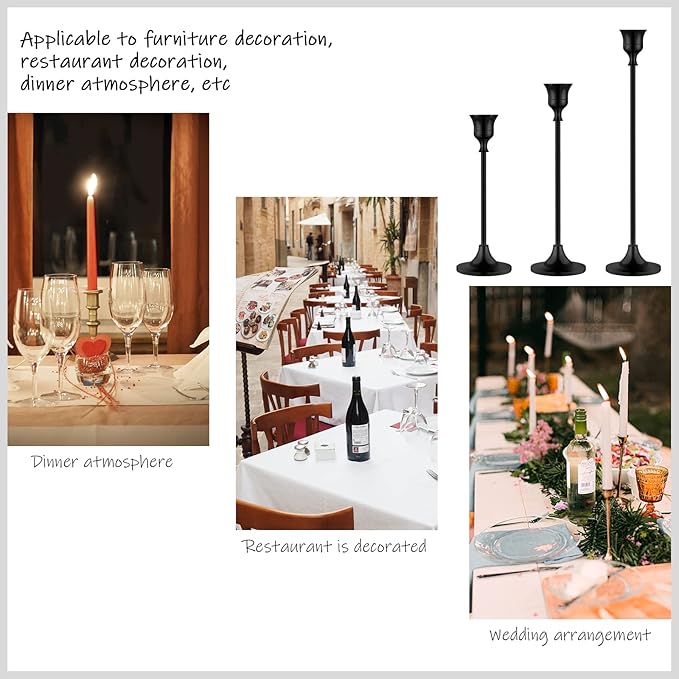 - 👍【Sturdy and Stable black candlestick holders】Made of solid, durable, high-quality aluminum alloy material,this candlestick holder is durable and sturdy enough to hold tall taper candles. Each black candle stick holder set can fit 3/4 inch and 7/8 inch small pillar candles as well as LED cone candles to match your dining table decor.It provides a stable base for your candles,ensures stability and longevity for your candles.