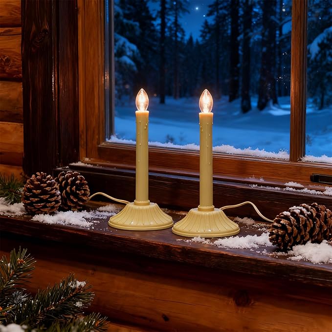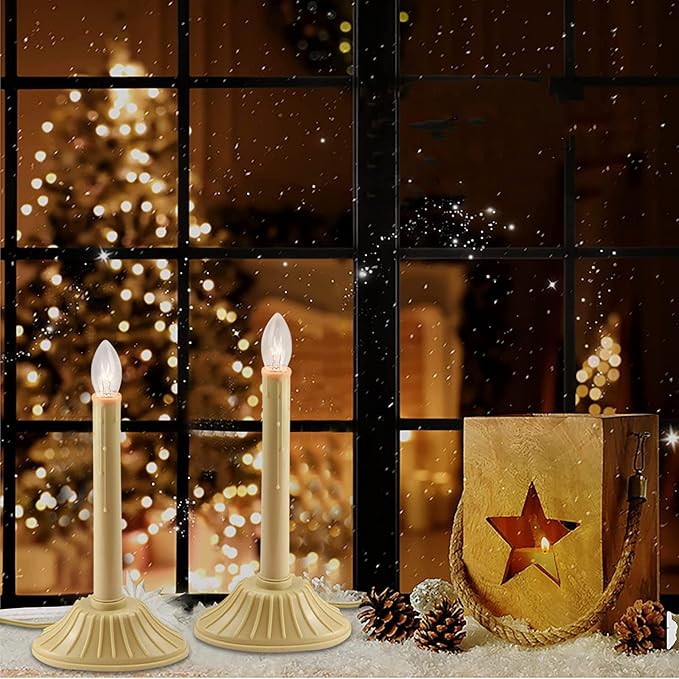 - 2 Pack 1 Light Christmas electric window candles lamp with 4 Clear C7 light bulbs(2 spare bulb), Vintage Ivory candle lamp glow a warm , great for Christmas window home holiday decorations and lighting.
