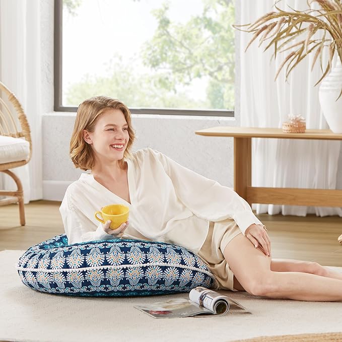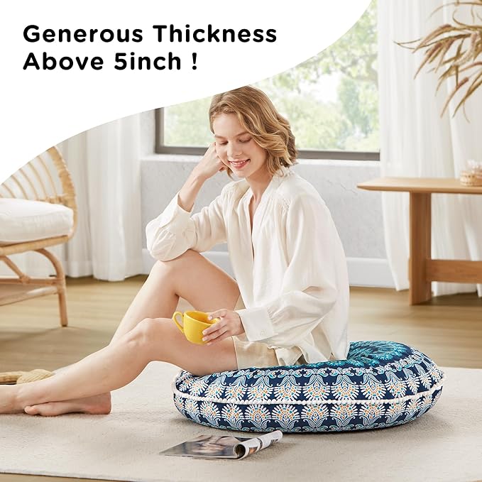 Codi Meditation Floor Pillow, Round Large Pillows Seating for Adults, Bohemian Mandala Circle Cushion for Outdoor Fireplace Yoga Living Room, 32 Inch, Memory Foam Added, Navy