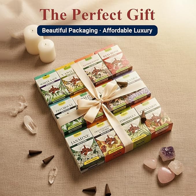 Tulasi Backflow Incense Cones with Natural Oils, Scents Set of 12 Fragrances (120 Cones) Calming Home Aromatherapy, Yoga, Meditation, Relaxing, Mixed Scents with Natural Oils, Thanks Giving