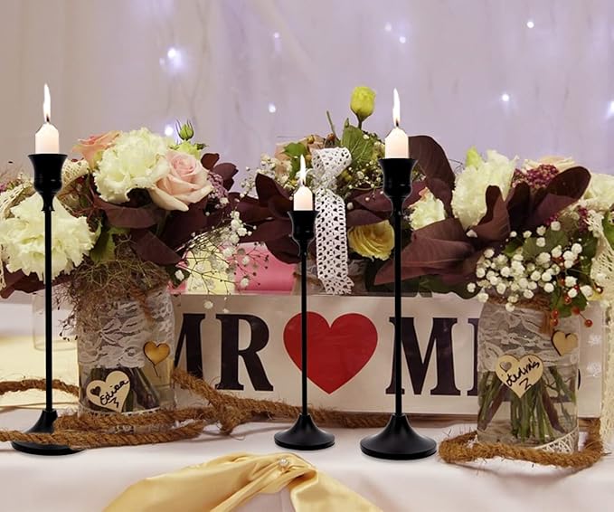 - Package included- 6 PCS matte black taper candle holders, three different size, L:9.25"*2.65", M:7.48"*2.65", S:5.91"*2.65", suitable for 3/4inch candles and led taper candles. Candles not included.