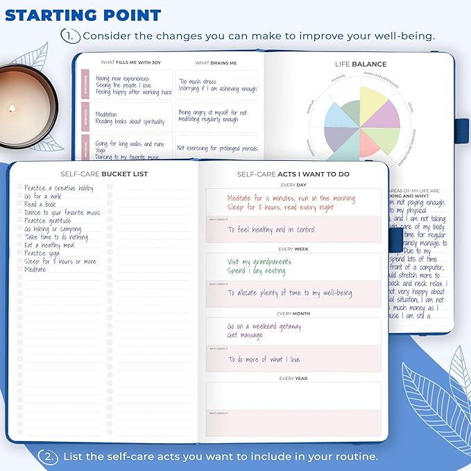 - BUILD A HAPPIER & HEALTHIER MINDSET FOR YEARS TO COME: This self care notebook is filled with prompts, open-ended questions, wellness trackers, and many other tools to help you pinpoint the changes you can make to improve your well-being.