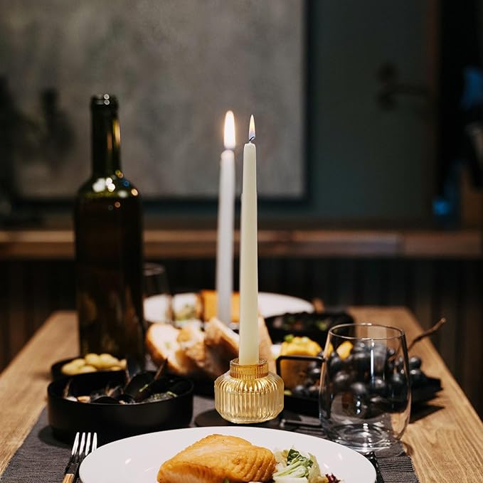 - [Gold Tapered Candlestick Holders]:Pretty taper candle holder with champagne gold color, they fit taper candles perfectly and added an elegance look to the table, create a gorgeous atmosphere. Optical glass & vertical stripes designed are absolutely stunning, cast warm candlelight brightly when light up tealights