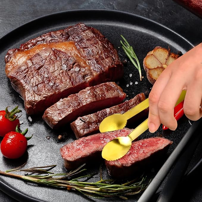 • [DURABLE AND EASY CARE] With smooth edges and flexible handle, you can comfortably grip and hold food with these mini tongs. Stainless steel small tongs are rust-resistant and have a shiny finish that is easy to clean with water and dishwasher safe.