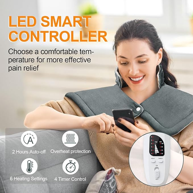 - Extra Large Size & Multi-Purpose: The unisex oversized 17"x23" heating pad provides full and comfortable coverage. Weighted edges with stone help the heating pad drape naturally to better fit the body and Small details of a snap fastener on the shoulders allow the shoulder heating pad to be worn on the body stably and free your hands. You can also wrap it on the waist, abdomen, legs, knee and arms to relieve your muscle soreness and body fatigue.