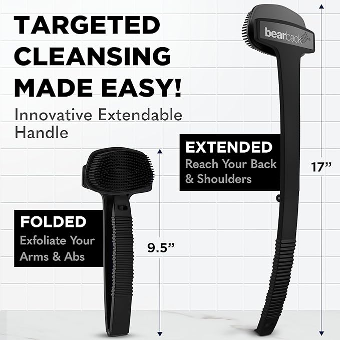 - Adjustable Reach, Compact Control: The folding handle extends to 17” for back and lower-body reach, then collapses to 9.5” for precise scrubbing on arms, neck, or torso. It’s perfect for travel, storage, and daily use.