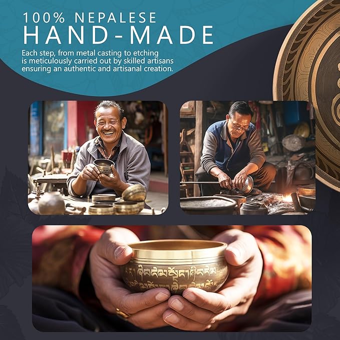 - Authentic Artisan Craft: Each meditation bowl is handcrafted in the Himalayas with traditional techniques, featuring an intricate and durable design. A unique piece of spiritual décor that enriches your meditation environment.