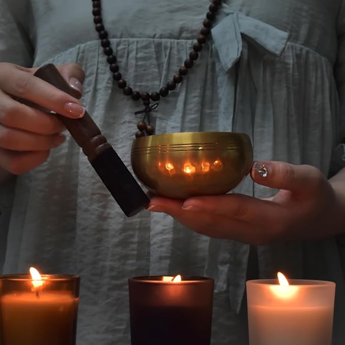 - TRADITIONAL HANDICRAFT :The singing bowl is crafted from high-quality copper, tin, zinc, iron, silver, gold and nickel, and features intricate craftsmanship with thousands of hand-hammered marks. The cymbals are forged with traditional techniques, are made of a special bronze alloy, which includes a mix of 7 metals to produce harmonious tones. Agarwood beads bracele is made of natural agarwood, emitting a unique agarwood fragrance, It has a calming effect.