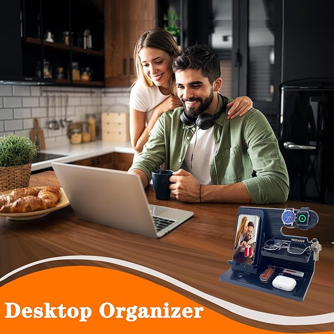 - Versatile Men's Bedside Organizer: Our cellphone stand features designated compartments for wallets, eyewear, watches, keys, fitness trackers, and an array of accessories, solidifying its status as the ultimate bedside organizer for men. Bid farewell to cluttered workspaces and adopt an organized way of life!