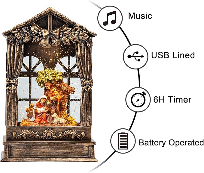• ❄【Nativity scene】Nativity scene Lighted Water Lantern Snow globe. When turned on a warm LED shines down on the figurine and swirling glitter to give our water lantern a whimsical look for the Holiday Season.