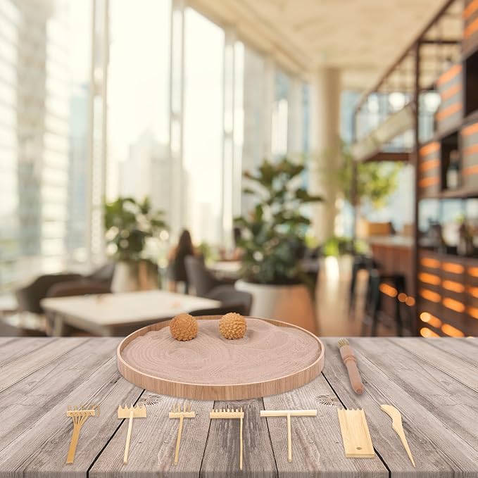 - Desktop Zen sand garden kit: Including 12’’large round bamboo tray, 7 mini zen garden rake kit, 2 stamp spheres, sand brush, and natural sand. The Zen garden for desk is multiple designed for tactile and visual play.