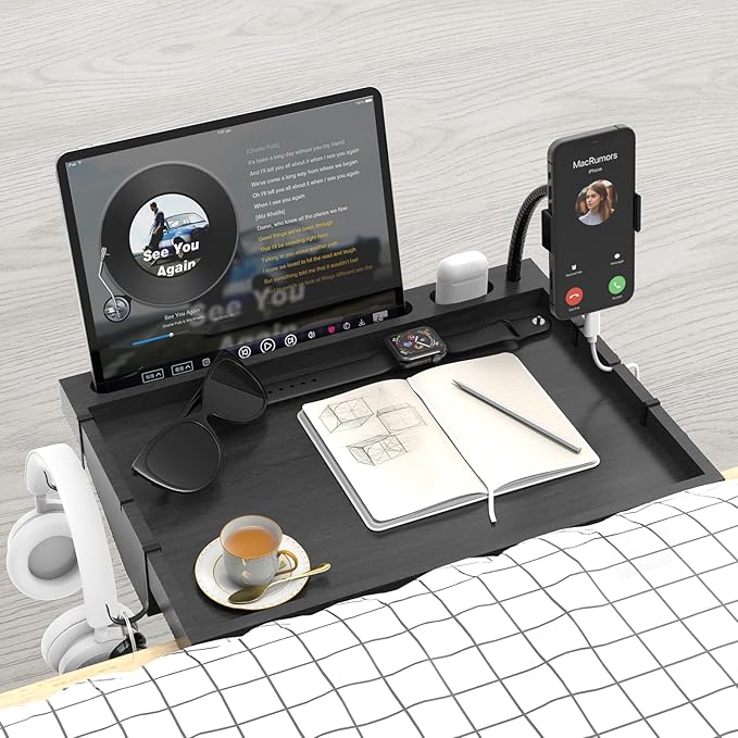 Bedside Shelf with Phone Holder for Bed, Bamboo Bed Shelf Organizer for Top Bunk, Clip on Nightstand for College Dorm Loft Bed, Bedside Tray for Kids, Built Earphones & Tablet Slot