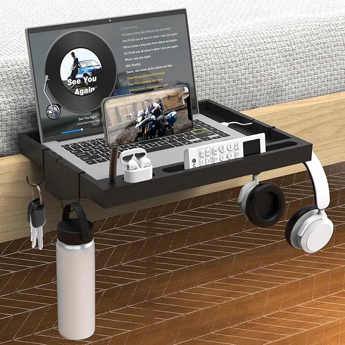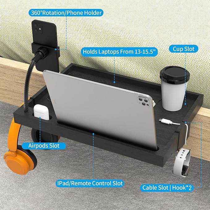 - 【Large Size Bed Shelf】: This large bunk bed shelf has a large 15.7" x 11.6" surface and is designed to accommodate 13 to 15.5" laptops. In addition, this bunk bed shelf has been specially designed with many user-friendly details to enhance practicality. The high edges around the perimeter protect the product, and the unique built earphones & tablet slot securely store and protect them to reduce the risk of drops. Side hooks provide additional storage space for organizing or hanging small items.