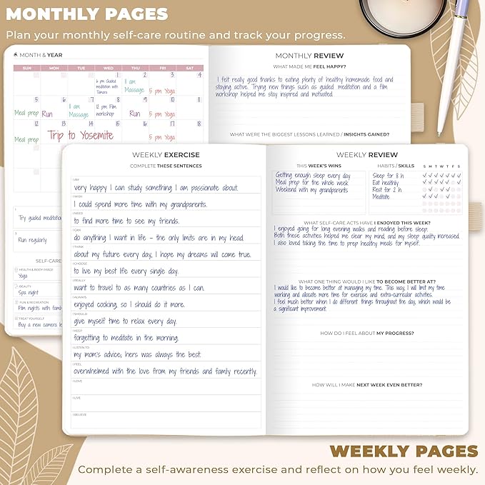 - BUILD A HAPPIER & HEALTHIER MINDSET FOR YEARS TO COME: This self care notebook is filled with prompts, open-ended questions, wellness trackers, and many other tools to help you pinpoint the changes you can make to improve your well-being.