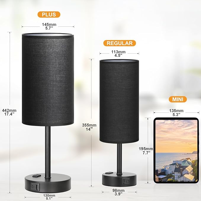 Fenmzee Touch Nightstand Lamp - Black, 3-Way Dimmable, USB A + C Charging, AC Outlet, 17.4inch Medium