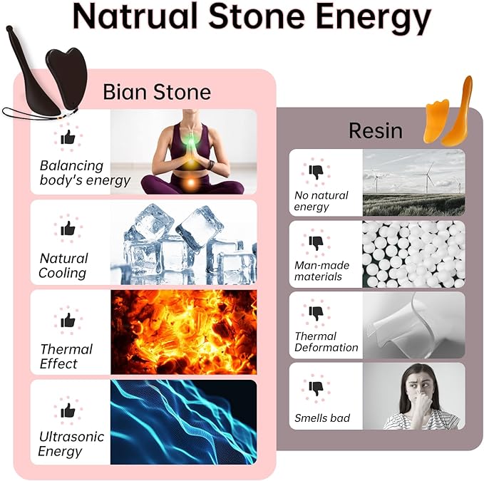 - 【Balancing Energy, Inside Out】Bian Stone Gua Sha Scraping Massage Tool is crafted from natural materials and enhances skin care with its thermal effect boosting blood circulation. Bian Stone's magnetic energy calms the mind. The natural cooling effect after freezing can better swelling. An ideal alternative to plastic Gua Sha and ice rollers for skin care.