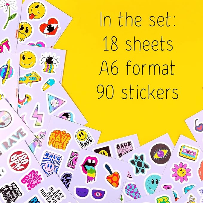 - STICKER SHEETS - rave sticker pack contains several sheets. Sticker sheets are less likely to get damaged or bent compared to loose, cut-out stickers.