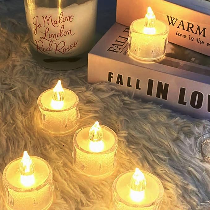 - 【NEW DESIGN & HOME DECORATION】These 48 pack "Crystal" LED tea light candles, make your room full of sweet and romantic atmosphere! Beautiful decoration night lighting for wedding, party, votives, dating, valentine, festival celebration, dinner.