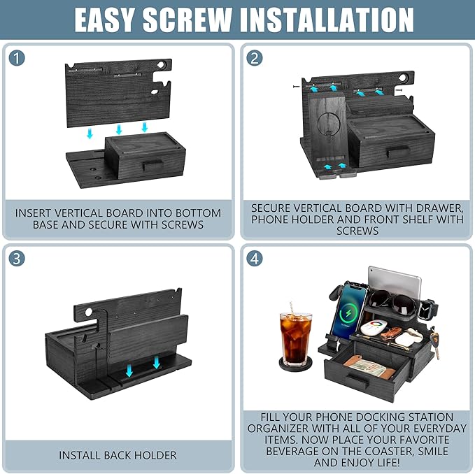 - ✅ KEEPS YOUR DAILY ESSENTIALS WITHIN REACH: Our night stand organizer docking station has thoughtfully designed shelves, slots, hooks, and even a drawer - easily store things like a phone, tablet, keys, watches, wallet, pen, glasses, rings, earbuds, and more. Now with factory-installed pegs, so setup is easier than ever!