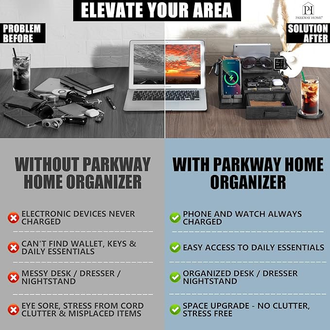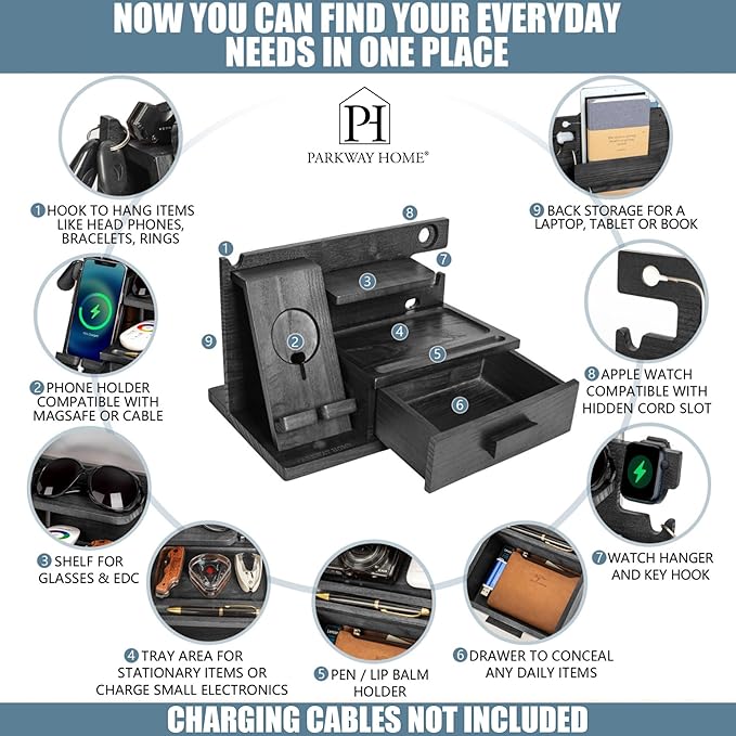 - ⌚️ A PLACE FOR EVERYTHING & COMPATIBLE WITH APPLE WATCH: Our wood docking station for men provides a special space that is made for an Apple Watch Charger; Plus, you get hooks to hold keys and rings, a shelf for sunglasses and EDC, a pen slot, and even a drawer for valuables. Now with larger pre-drilled holes for an even better fit when securing your organizer!