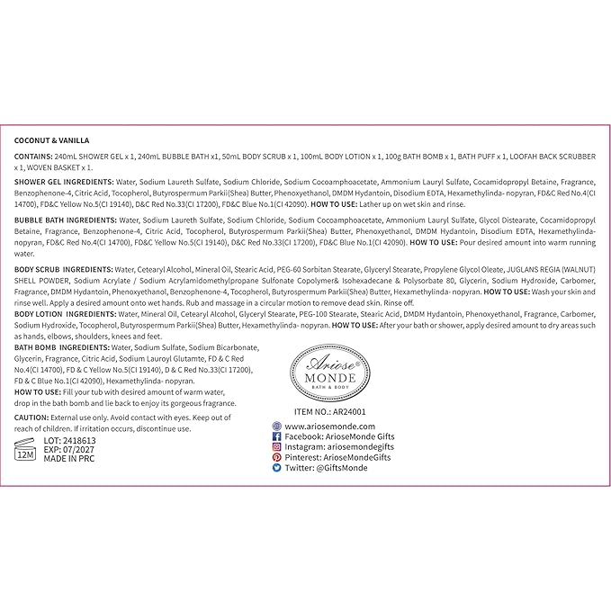 - THE PERFECT GIFT FOR ANY OCCASION: This Coconut Vanilla Bath Gift Set is the perfect gift for birthdays, holidays, Christmas, Mother's Day, Valentine's Day, wedding anniversaries and more. Its luxurious and pampering products make it a thoughtful and versatile gift option