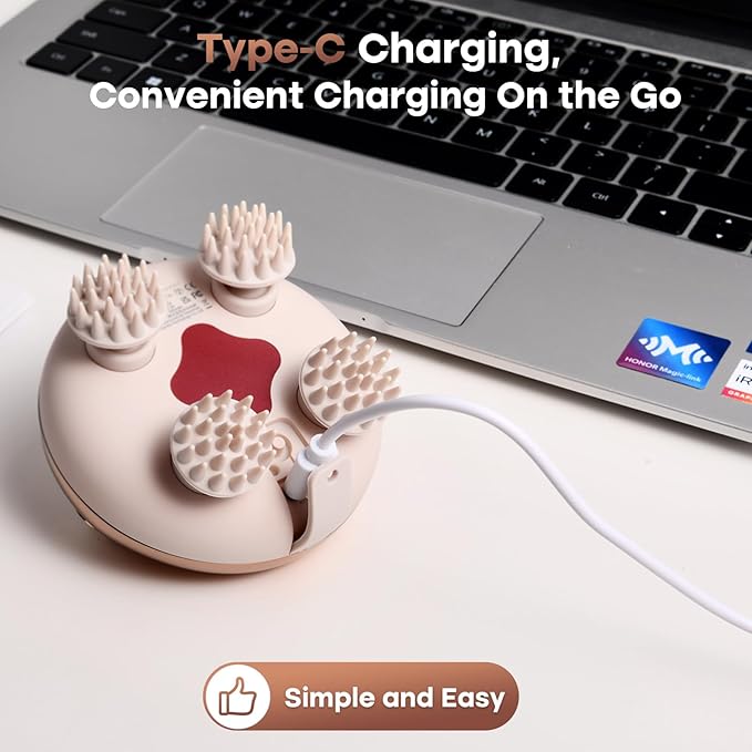 - Tangle-Free & Silicone Massage Claws: Hair massager features 8 silicone massage heads with a total of 128 nodes, The No-tangling conical massage head design ensures precise targeting, allowing you to pinpoint specific areas for optimal massage results. Enjoy customized relaxation, reduce fatigue, and experience profound comfort with soft and stable massage heads. Lovely Cat Massager.