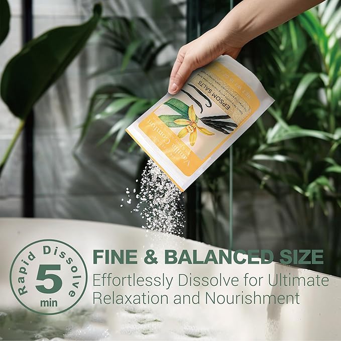 - Epsom Salts: Formulated with epsom salt and essential oils. Add a few spoons of epsom salts for soaking into bathtub or foot bath by using the cute bath salt wooden spoon included, it dissolves quickly in warm water leaving no residue