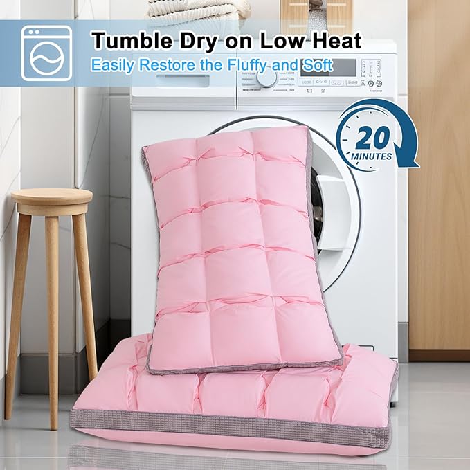 - 【Dry! Instant fluffy!】Your pillows may arrive slightly bunched or harden due to Vacuum compression. Don't worry ! No need to wait long to get back fluffy! You can use the dryer directly for low temperature drying, will quickly achieve a better fluff effect!