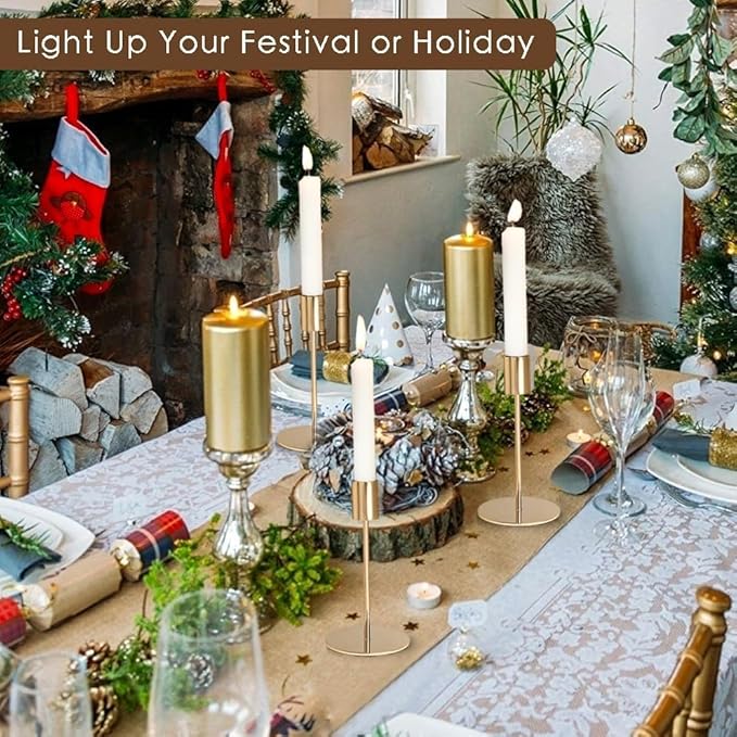- [Wide Application] You can put these beautiful gold candlestick holders on the dining table,mantelpiece or anywhere you like. They are perfect for decorating your home, living room, fireplace, dining table, bar, garden, shop, restaurant, café, bar, etc., and can also be used as decoration or gift for occasions such as wedding banquets, Christmas, New Year, birthdays, anniversaries, housewarming parties, etc.