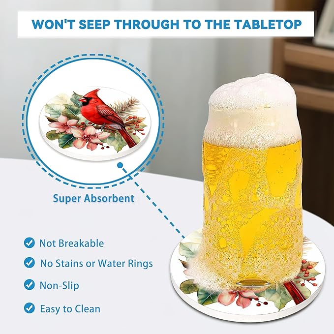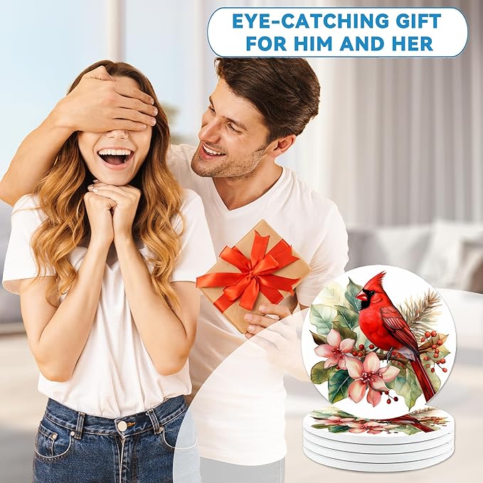Cardinal Coasters Set of 4, Absorbent Ceramic Stone Coasters with Cork Base, Winter Christmas Home Decor, Ideal Gifts