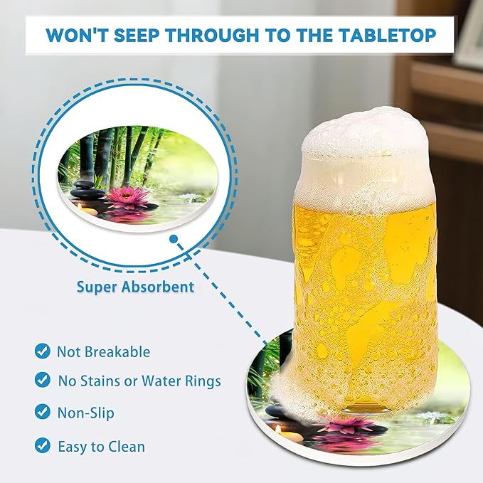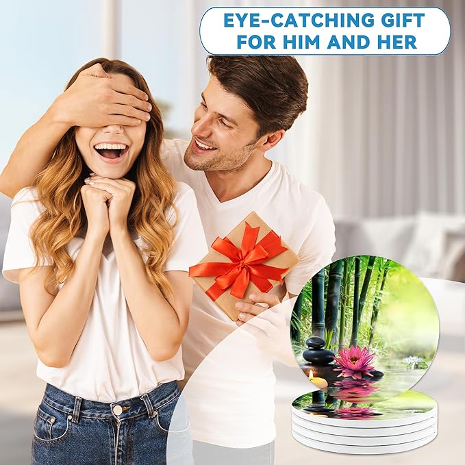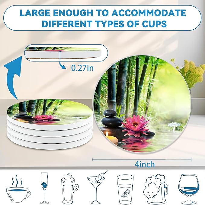 Zen Bamboo Round 4" Cup Coasters Set of 4, Absorbent Ceramic Stone Coasters with Cork Base, Ideal Home Decor Gifts
