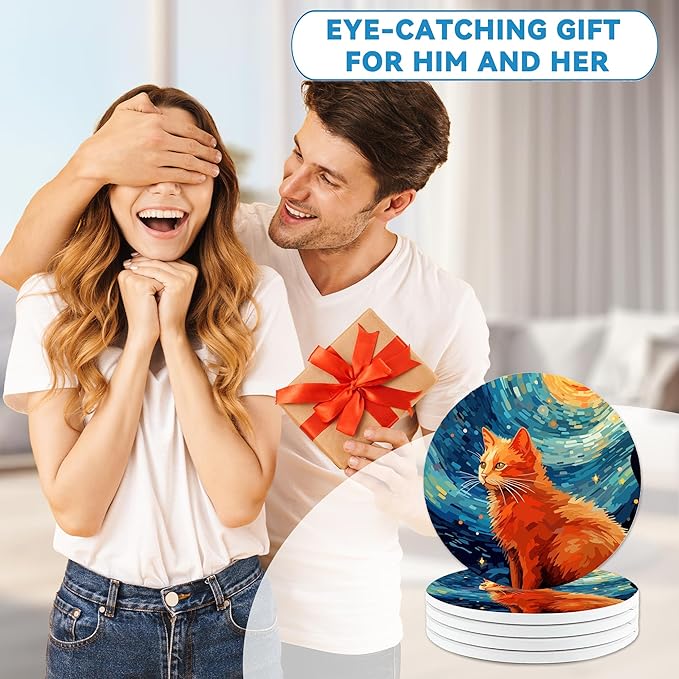 Starry Night Cat Coasters Set of 4, Round 4" Absorbent Ceramic Stone Coasters with Cork Base, Cute Table Home Decor, Ideal Gifts for Women Men