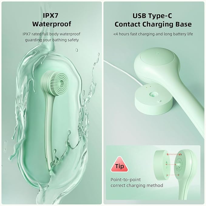 - Wide Application: Comes in a minimalist design gift box. Package includes: bath brush body, 3 brush heads, USB (Type-C) cable, contact charging base, manual and 3 wall accessories. Can be hung with wall-mounted accessories for easy storage without taking up space in the bathroom. This electric body brush works at the touch of a button, available in 4 colors. Perfect as a gift for a loved one or friend