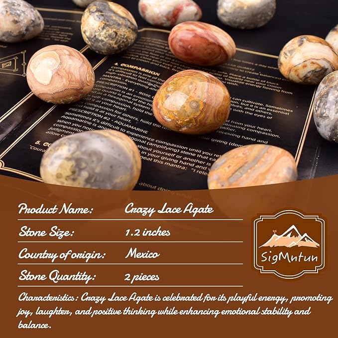 Polished Crazy Lace Agate Crystal Stones - 2 Pcs of 1.2" Worry Stone for Anxiety, Pocket Palm Stone Super Large Handpicked Natural Tumbled Gemstones for Meditation, Reiki, Chakra Healing, Home Decor