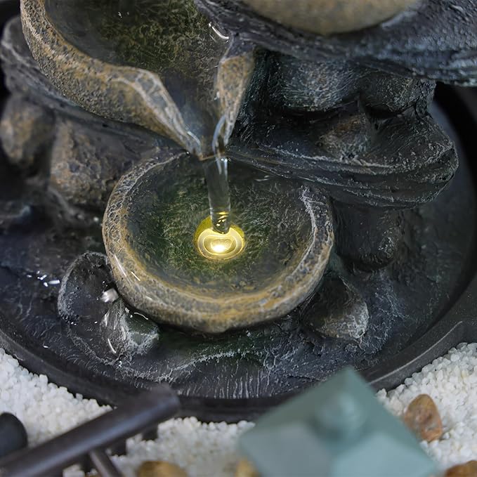 Indoor Tabletop Water Fountain with LED Lights & Pagoda, 4-Tier Rock Cascading Design, Artificial Flowers, White Stones and Rake, Zen Decor for Office/Living Room/Bedroom/Study (8.5" H)