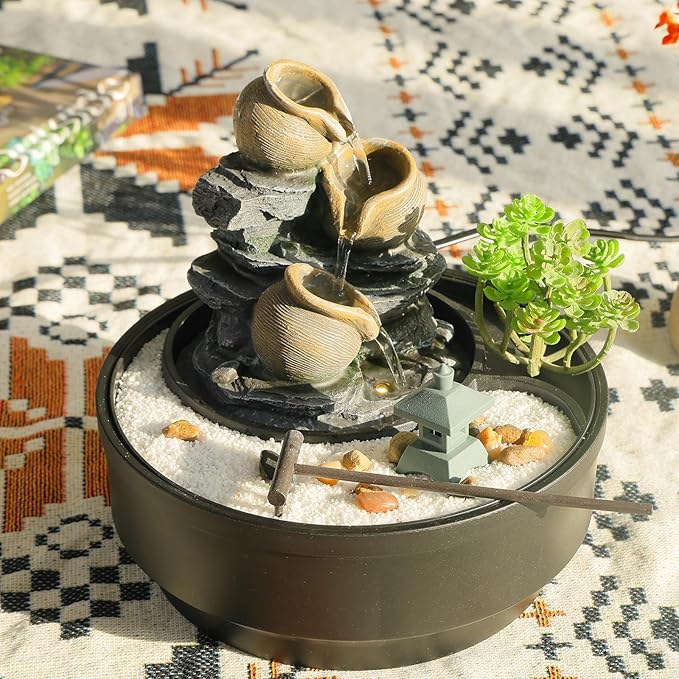 - 【Unique Design】The size measurement of this indoor fountain is 8.5x8.5x8.3 inches, featuring a design of Constructed from Durable Resin with a Zen Look and Incorporates Elements Such As Sand and Gravel. and soothing flowing water. The soothing sound of water brings relaxation.
