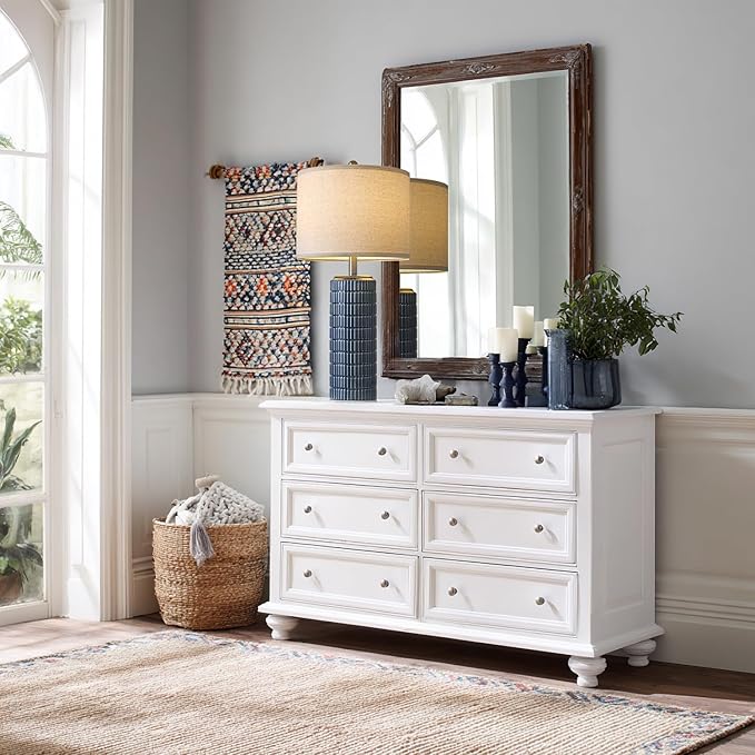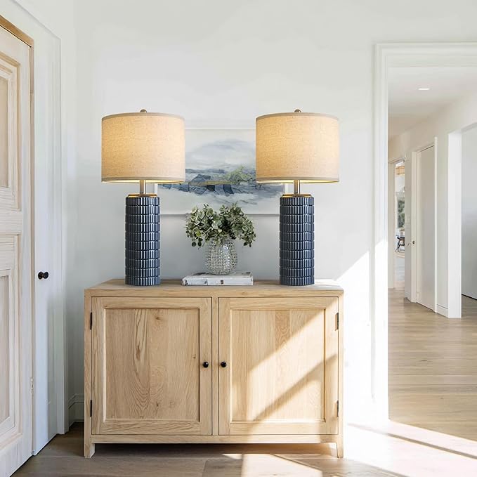- Dark Blue Design: The base of this living room lamps is dark blue, adorned with light white vertical stripe accents. Made from a high-quality ceramic base and a handcrafted linen shade, this living room table lamps add a glance of elegance to your home and creates a warm and cozy atmosphere in the evening, an ideal choice for home decors like farmhouse decor and modern decor.