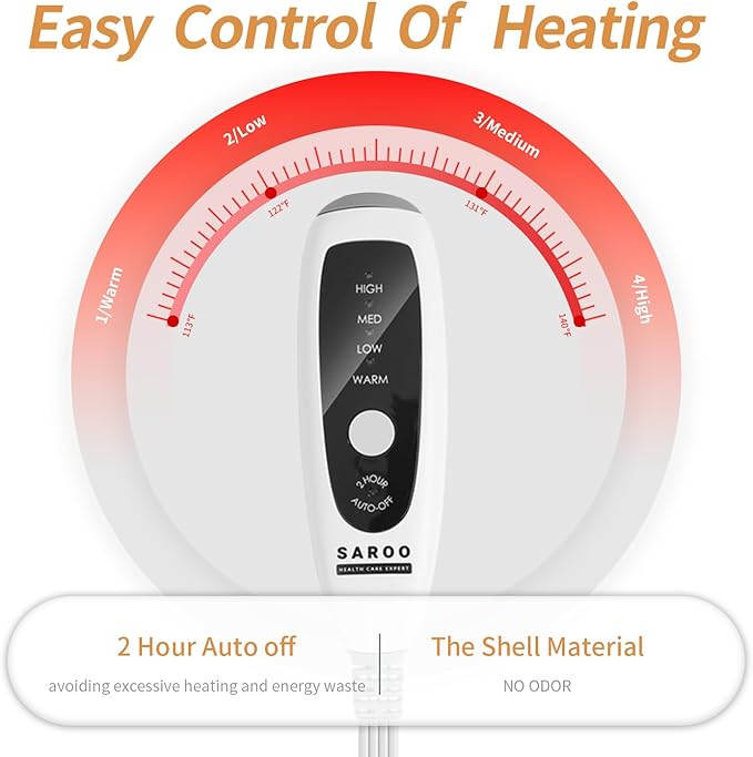 - FAST HEATING TECHNOLOGY: Heat pad adopts the latest heating technology, which can heat up quickly in a few seconds. Fast heating with 4 levels of temperature adjustment which range from 113℉ to 140℉, experience a temperature better suited to you,which will auto turn off after 2 hour of continuous use. Shoulder heating pad also has overheating protection to prevent burns that increase safety during use.