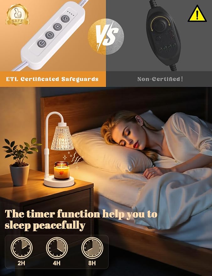 - 【Dimmable Candle Warmer Lamp with Timer】Our controller features four brightness settings and a timer function, and comes with an ETL-certified switch for added peace of mind. You can adjust the brightness to control the speed at which the fragrance is released, tailoring it to your personal preferences. The timer function means you can leave home without worrying about forgetting to turn the candle light off