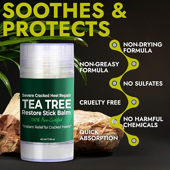 - Tea Tree Oil Power: This foot balm stick for dry cracked feet for cracked heels hydrates, repairs, and restores even the toughest skin. Its natural antibacterial properties soothe irritation, fight odor, and keep your feet feeling fresh, clean, and protected daily.